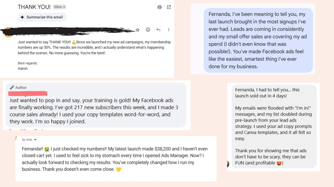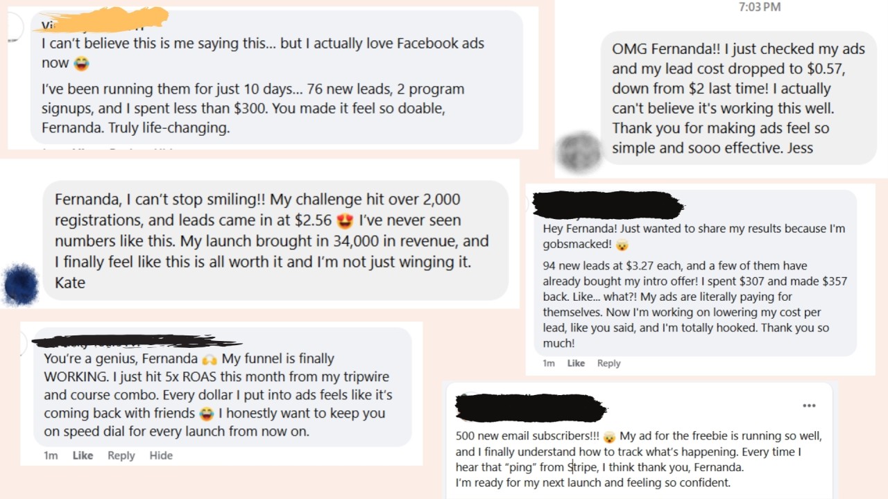 "Hey Fernanda, thanks for the Facebook ads training! The latest ad for the freebie is running super well, 500 or so in my e-mail list. It’s all going so well, and I am so pleased to have a better understanding of the ads manager! Thank you so much!”